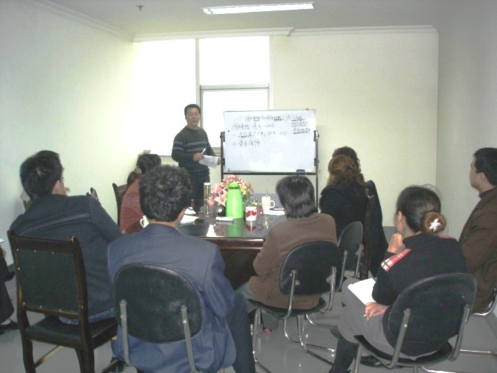 在这个知识+资本”的年代只有不断补充新的技能才能应对职业上的种种挑战。所以建立规范的、科学的培训机制是企业发挥人才优势的必要前提。金苹果公司根据当前员工的知识层次、结构、特点,开展了各种类型的内部培训活动,由经验丰富的营销总监、人资主管、技术骨干等组成培训队伍,规划培训计划,对员工适时进行内部培训,以保证每一名员工素质的一致性,以及员工与企业文化、企业发展方向的充分吻合。 图为营销总监进行营销基础培训