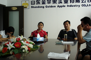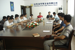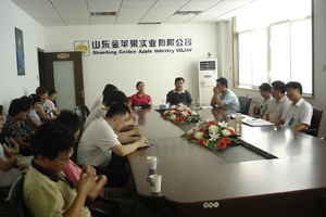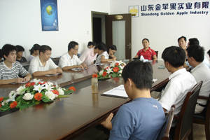 定时或不定时召开全体员工大会是金苹果公司的一贯传统。2008年8月16日,公司为欢迎新入职的员工组织了全体会议。 会上,新入职的员工分别做了自我介绍,公司董事长王正明先生诠释了公司的企业文化及经营理念,总经理孙海燕女士就公司目前的发展状况及未来的前景作了详细的介绍、分析。 会议在一片欢呼声中结束。 图为全体会议的情景照片