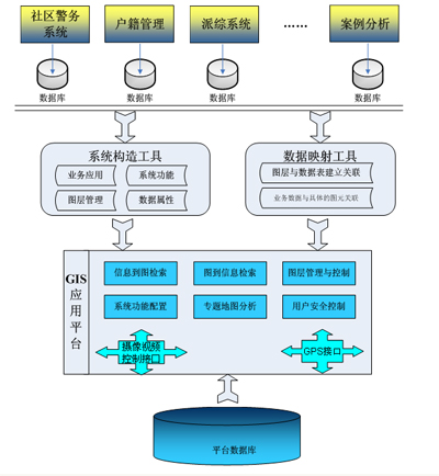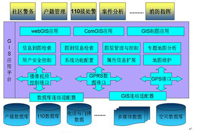 近年来, 随着公安部“金盾工程”的启动,公安网络基础设施条件和信息化应用水平的不断提高,地理信息技术也开始越来越受到各级领导与业务部门的重视。将公安信息化建设与地理信息技术紧密结合起来,大力开展警用地理信息系统建设,是今后全国各地公安信息化应用的一个重要发展方向。公安的信息化改造正给刑事技术、交通管理技术、行动技术、安全防范技术等公安的科学技术发展带来很大的推动。在进一步改进军警快速准确的作战能力、指挥高效、协同作战、反应灵敏,处置快捷、防范有效、控制有力、保障可靠等方面将越来越依赖于信息化的发展和提高。特别是实时语音、图像、计算机数据的快速可靠传输尤为迫切。警用地理信息系统为构建社会治安防控体系新格局提供一个统一协同作战的工作平台。高质量的信息化建设成果,必将在公安实战中发挥更大的作用,警用地理信息系统建设必将为推动社会治安防控体系建设提供更有力的支持,必将为建立和完善治安防控体系新格局做出新的贡献,必将会在未来的工作中发挥越来越重要的作用。通过建立公安GIS应用平台,使公安局信息系统管理员能够在充分了解当前其他应用业务系统功能及数据库结构的前提下,把该应用业务系统中和地理信息相关的功能业务在平台上建立功能链接,并把相关的业务数据和地理信息平台数据图元建立映射关系,使警务人员能够在平台上把该应用业务系统数据信息直观的展现出来。如下图所示: